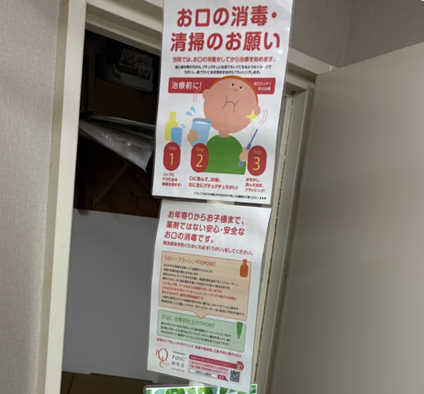 歯科医師並びにスタッフはマスクをし、隣の診療台との間には仕切りがありますが、念の為万が一咳き込む場合はティッシュ・ハンカチ・服の袖等で口鼻を覆う「咳エチケット」にご協力ください。