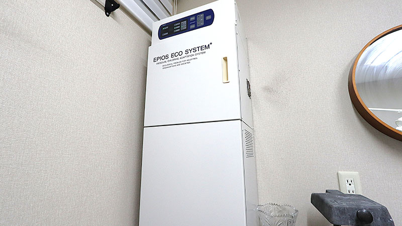 当院導入の『POICエコシステム』は、薬品を使わず純水と塩を電気分解して高い殺菌力を持つ機能水(殺菌水)にして院内の水に循環させ、配管内の細菌繁殖を防止します。