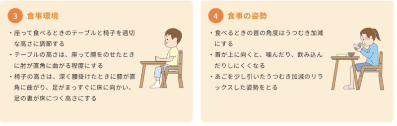 両足が床につく椅子・机の高さ、食事の時の姿勢を整える。